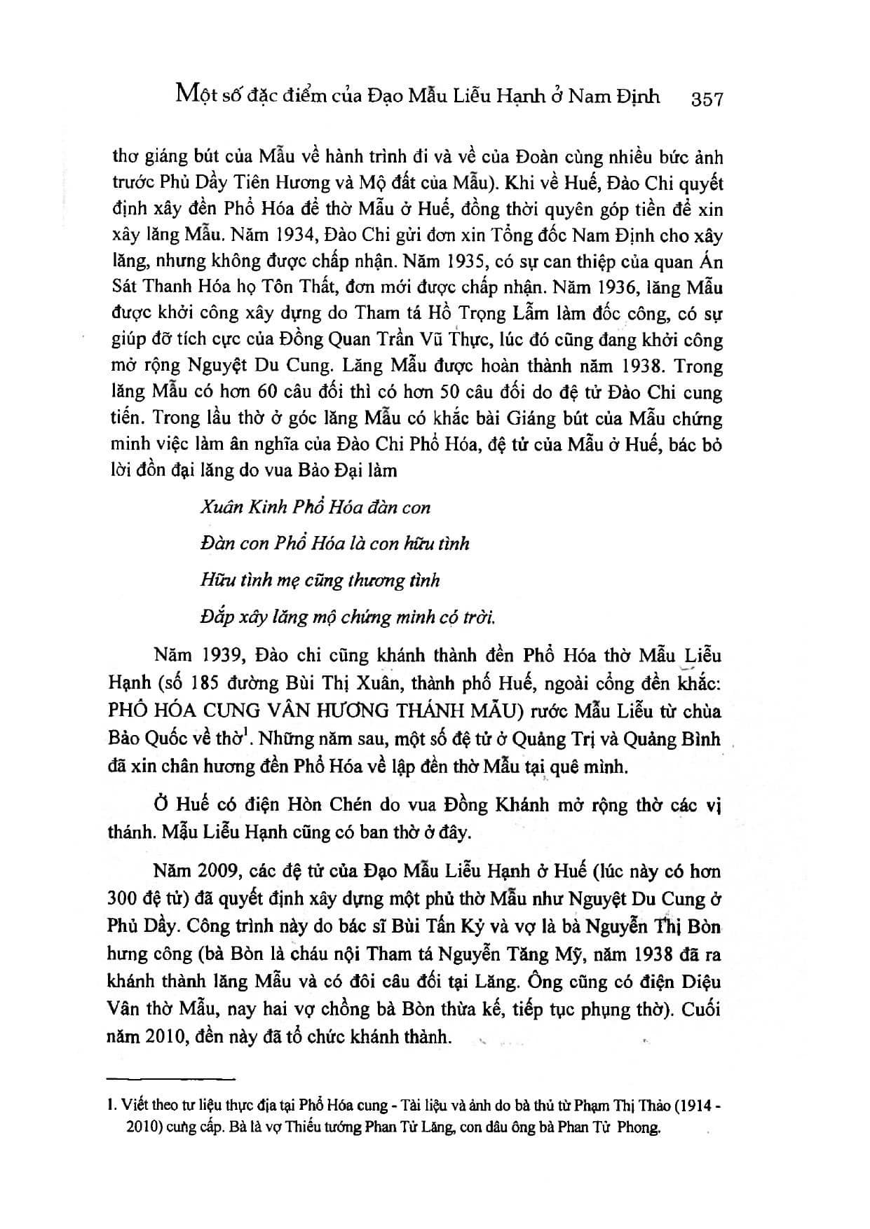 Rất may mắn, cái tên Đào chi Phổ Hóa ở kinh thành Huế đã được nhà nghiên cứu Bùi Văn Tam khảo cứu trong cuốn sách “VĂN HÓA THỜ NỮ THẦN- MẪU Ở VIỆT NAM VÀ CHÂU Á” trong bài viết “Một số đặc điểm của Đạo Mẫu Liễu Hạnh ở Nam Định” từ trang 342 có phần khảo cứu về đạo Mẫu ở các miền khác như sau:
