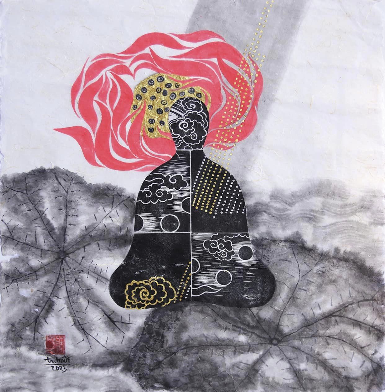 Chị cũng tiết lộ: “Trong thế giới ý niệm của chính mình Phật là một biểu tượng, Phật vừa rõ ràng hiển hiện trong những hành động sống của mỗi con người, nhưng bên cạnh đó theo quan niệm của người Việt “Phật tại tâm” là một khái niệm đầy tính chất tinh thần. Thông thường nhất Phật gắn liền với biểu tượng hoa sen, một giá trị tượng trưng từ ngàn đời về sự thanh khiết, sự vươn lên trong bùn nhơ, uế tạp để nở ra những cánh muốt ngần với hương thơm ngát dịu. Với tôi, trong những bức tranh của mình hình bóng như dáng ngồi của một vị chư Phật là một ý niệm không tương liên với giáo lý, tôn giáo mà chính là ảnh xạ của sự phản ánh biểu tượng đó. Nó như sự hiện hữu của thế giới tinh thần một cách trung trinh, ôm trọn vào đó các giá trị. Trong đó có mưa gió, có núi sông, có sen nở sen tàn, và có cả bản nguyên của con người, nhưng tinh thần trung trinh đó dường như không thay đổi. Nó lấp lánh rực rỡ, hào sảng và cuốn hút tôi vào dòng thác lũ của những cảm xúc sống dậy trong mình. Cảm xúc ấy như sự yêu đương mãnh liệt của thủa đôi mươi. Và, dẫu vẫn vẽ những đôi môi hoá thành chiếc lá, cánh sen như nhiều năm trước, nhưng rõ ràng xúc cảm để soi chiếu nội tâm trở nên rõ ràng.”